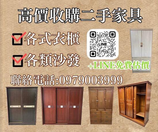 大台中地區、南投地區、彰化地區,收購您用不到、不需要的二手家具,如滑門衣櫃、實木衣櫥、單人衣櫃、斗櫃、收納櫃、L型沙發、1+2+3人座沙發組、貓抓皮沙發、布沙發、木頭沙發、花梨木組椅等都有收,歡迎撥打連絡電話:0979003999或是+@qq999即可免費線上估價,價格公道合理,服務親切快速,全省皆有服務據點,品質安心有保障,師傅會跟您約時間過去搬貨,不需要付額外費用,我們以現金交易為主,不用擔心被多收費用或是東西被搬走拿不到錢!