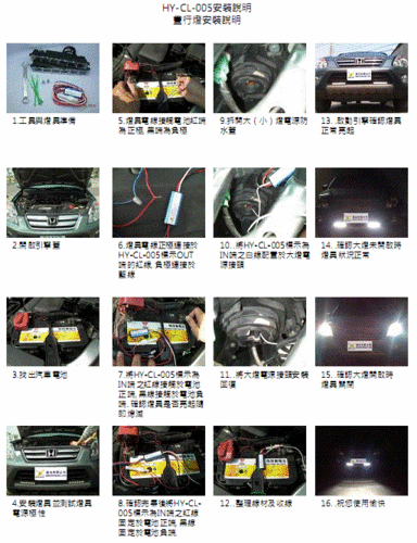 HY-CL-005應用於12V車用電源系統,於汽車啟動狀態自動提供12V電源予外接裝置如晝行燈,最大供應輸出電流為1.5安培,汽車熄火時即自動關閉外接裝置的電源供給,汽車靜止時幾乎不耗電,並提供電源極性保護與保險絲保護,避免誤接導致汽車系統或外接裝置的損毀,國際CE認證更能確保安全的品質。簡易的安裝方式,僅需將輸入信號端的紅黑電源線連接於電瓶正負端,輸出信號端的藍黑電源線連接於外接裝置的電源正負端,當汽車啟動時即可使外接裝置如晝行燈獲得安全且獨立的電源,另提供一白色控制線以關閉外接裝置之電源(如控制線連接於汽車大燈,當大燈亮起時即可關閉如晝行燈的外接裝置)。獨立的電源裝置不需破壞車體,不需破壞車內配線,更不會影響汽車系統的正常運作。汽車的總成為人類科技的極致表現,汽車系統是由無數工程人員在性能與安全的取捨間所計算規劃而來,外接裝置縱使提升功能性卻在強行介入系統中破壞了整個系統的平衡,而往往被犧牲的卻是安全的考量。HY-CL-005提供安全且獨立的電源供給,獨立的電源供給不僅讓外接裝置發揮其功能更保障了行的安全。