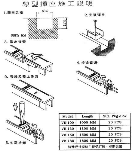 本產品多適用於百貨公司、店面展示架的日光燈具及其他燈具接續電源時使用、只要由插座線頭的一端接線入電、即可整條導電槽都呈供電現象以利插頭插入導電槽而提供電力傳輸到須供電的燈具上。(台灣製)