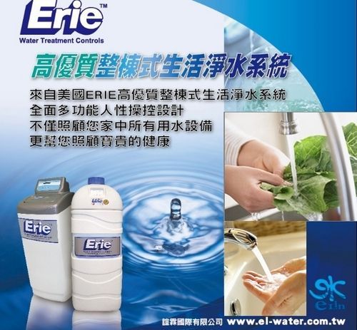 美國Erie全棟式淨水設備,提供您高優質家庭用水生活最佳選擇,更是未來趨勢,不但可將水中的雜質、沙土等固態懸浮物濾除,並降低水中的氯氣、鐵鏽、硬度等,去除對人體有害的物質,讓每一個水龍頭都流出滴滴潔淨的好水,它將家中所有的用水都經過淨化處理,包含了最基本的飲用水及其他的沐浴用水、洗滌用水、洗蔬果等、設備用水(熱水器,洗衣機等),讓您吃的、喝的、洗的、用的都是優質潔淨好水。