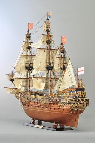 「海上君王號」於1637年建造完成,是英國查理一世時期所建的第一艘擁有3層統長甲板的大型戰艦,船上裝飾著大量華麗的神話人物造型和複雜的武器鑲邊紋章圖案。海上君王號曾參與17世紀的所有英荷戰爭(1652-1673),並曾參加1690年、1692年兩次對法作戰,身經百戰。1652年的海戰中,她僅用船的一側就將荷蘭戰艦擊沉,以至於荷蘭人稱他為「金色魔鬼」。 |