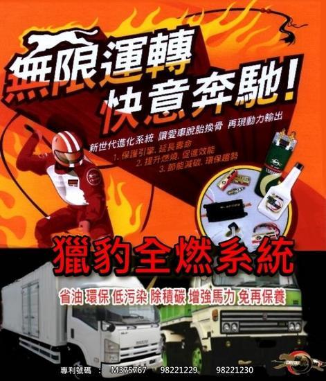| | 1. | 獵豹全燃系統商品資訊 | | | 2. | < 新型專利產品> 獵豹全燃系統 | | | 3. | CHEETAH「獵豹全燃系統」產品資訊 | | | 4. | 烏賊車剋星 環保小尖兵 -- 獵豹全燃系統 | | | 5. | 汽油引擎好幫手 | | | 6. | 柴油引擎好幫手 | | | 7. | 新型專利產品、環保新產品“獵豹全燃系統” | | | 8. | < 新型專利產品> 獵豹全燃系統商 | | |