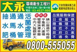 服務內容:通馬桶,通水管,通水管不通,水管不通,抽水肥,水溝清理,大樓污水,工廠廢水,馬桶住家,排水管不通,馬桶不通,廁所不通,大樓:水管堵塞,馬桶堵塞,公寓:水管疏通,馬桶疏通,商店:包通水管,包通馬桶,機關學校:通水管,通馬桶,清水肥,抽化糞池,廁所不通,小便斗堵塞,居家:陽台排水管,廚房水管,浴室排水管,馬桶不通,找大永衛生工程行,清理化糞池,自備水肥車,水管馬桶排水管包您一定通!專門清化糞池,抽水肥,廁所馬桶不通.陽台排水管不通.各種水管包通,工廠污水處理,清洗水塔水池