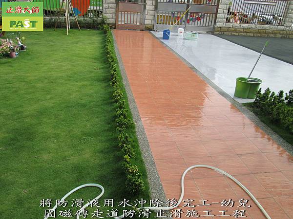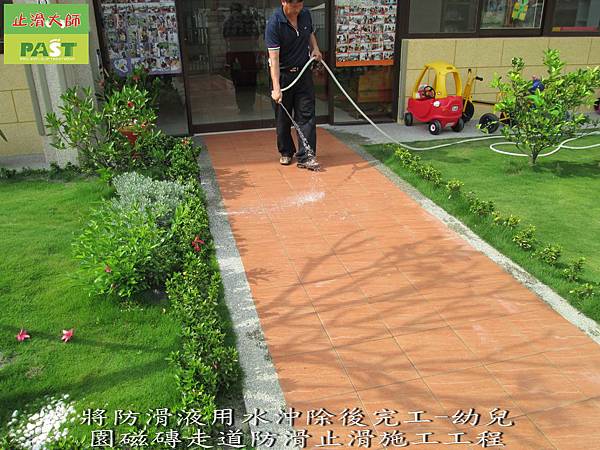 將防滑液用水沖除後完工-幼兒園磁磚走道防滑止滑施工工程