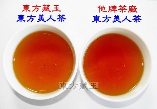 ●『東方藏玉-東方美人』,茶葉中「鮮嫩的心芽」、「著涎的茶菁」與「白毫肥大」占比較高,茶湯較油亮,呈金黃、琥珀色,喉韻甘甜香醇,蜜香味較他牌濃郁許多。