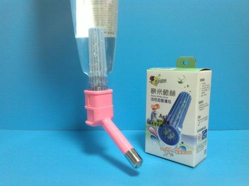 使用方式:奈米銀絲(Nano-Silver yarns)活性抑菌濾心依圖所示裝入寵物用飲水器內,再以自來水或蒸餾水裝入瓶內即可使用。【浸泡越久抑菌效果更加】【適用於各式樣飲水器】