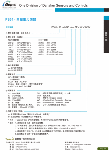 | | 1. | 3100系列薄膜式壓力感測器 | | | 2. | ELS-950系列光電液位開關 | | | 3. | LS-7系列測裝式浮球液位開關 | | | 4. | PS31C系列- 隔膜OEM微型壓力開關 | | | 5. | PS61系列高壓壓力開關 | | | 6. | RFA Type - 連續流量感測器 | | | 7. | FT-110系列渦輪流量感測器 | | | 8. | Gems 通用,隔離,超低溫電磁閥 | | |