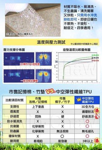 此坐墊體為專利墊體,由中空超塑烯聚酯纖維經過特殊編織方法做成纖維彈簧透氣墊,厚度1~3公分三度空間一體織造、立體設計,讓氣體於墊體內四通八達,達到春夏秋冬皆適宜若平均受力依然保持一定厚度彈性,讓氣體能前後四通八達進入墊體內,通風透氣彈性佳!上下層再包覆特殊織法的透氣網格布,美觀大方,能快速通風,排除因久坐而產生的熱氣!冬天使用可套上床包或是床罩等..讓身體睡起來舒適柔暖又釋壓~~讓您一夜好眠到天亮!!!