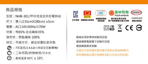 ![甲珍4段定時恆溫安全電熱毯NHB-301P]() |
