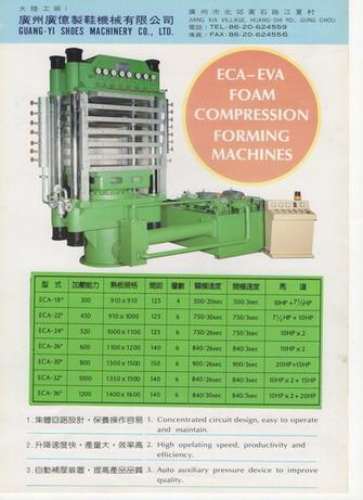 | | 1. | EVA一次發泡油壓成型機 | | | 2. | ECC碳纖維成型機 | | | 3. | EC碳纖維成型機 | | | 4. | EVA大發泡機 | | | 5. | ECC蒸氣油壓成型機 | | | 6. | EC鞋墊油壓機 | | | 7. | ECF電熱式橡膠油壓成型機 | | | 8. | EVA二次發泡成型機 | | |