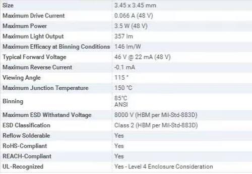CREE-XTE-HV,3535,3000K,48V,3.5W,66mA,357LM,146lm/W,500K現貨
