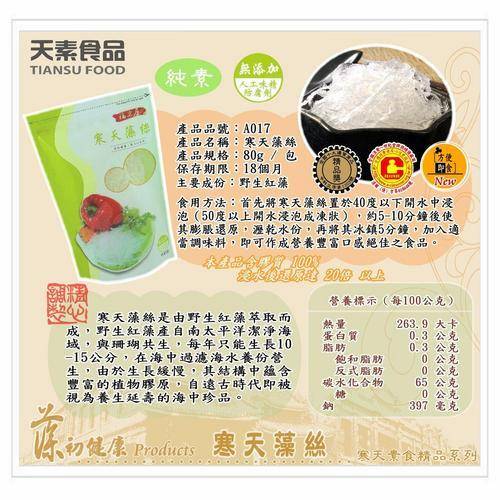 寒天藻絲是由野生紅藻萃取而成,野生紅藻泄自南太平洋潔靜海域,與珊瑚共生,每年只能生長10-15公分,在海中過瀘海水養份營生,由於生長緩慢,其結構中含有豐富的植物膠原、海中酵素、鐵質、鈣質、粗纖維、礦物質及微量元素,是所有藻類之冠,自遠古時代即被珍視為營養延壽的珍品。 產品售價:$ 350 元 |