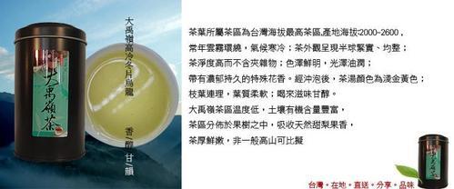 茶葉所屬茶區為台灣海拔最高茶區,產地海拔:2000~2600 ,常年雲霧環繞,氣候寒冷;茶淨度高而不含夾雜物;色澤鮮明,光澤油潤;帶有濃郁持久的特殊花香。經沖泡後,茶湯顏色為淺金黃色;枝葉連理,葉質柔軟;喝來滋味甘醇