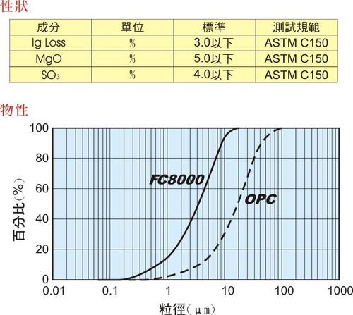 FC8000是無機質超微細水泥,具有早強、高強度及耐久性,適合於灌漿、修補及補強等用途。由於FC8000的顆粒均勻分佈,所以可以呈現令人滿意的灌漿效果。