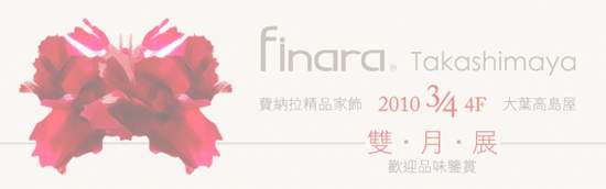 Takashimaya 天母大葉高島屋4F FINARA費納拉精品家飾雙月展(3月/4月,2010) ,活動期間,凡消費即贈加碼購物禮金600元 (限下筆消費使用),單筆消費滿10,000元,即贈爵士樂黑鱷魚皮革面紙盒乙盒(價值880元) ;單筆消費滿20,000元,即贈單細胞6瓶紅酒架乙個 (價值1,680元) ;單筆消費滿30,000元,即贈威尼斯海灘貝殼系列衛浴四件組乙組 (價值2,680元),(以上贈品皆不累送)。Finara Lifestyle Accessories為消費者妝點時尚品味家居,輕鬆打造歐洲精品飯店式豪宅,歡迎品味人士、舊雨新知前往鑑賞。