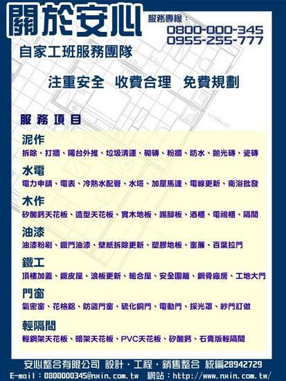安心整合有限公司 新北市蘆洲區三民路550號之1 TEL : 0800-000345 FAX : 02-22889995 |