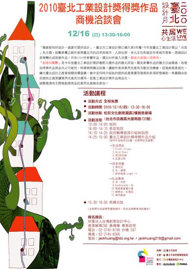 財團法人台灣創意設計中心,將於12月16日(星期四)下午13:30-16:00假台灣設計博覽會會場舉行「台北工業設計獎優秀作品商機洽談會」,邀請這次工設獎得獎作品及其他優秀的作品與廠商進行合作商機洽談,誠摯邀請有志開發創意商品的業者報名參加。