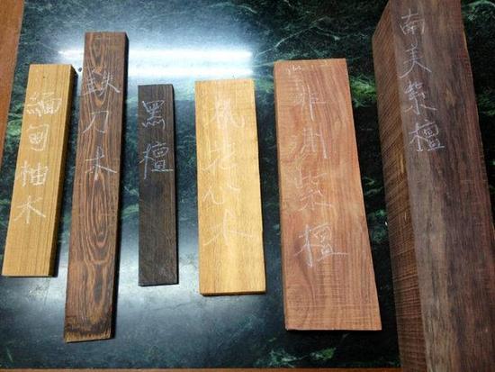 左一緬柚 左二鐵刀(雞翅)左三黑檀 右一南美紫檀 右二非洲紫檀 右三桃花心