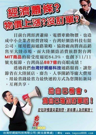 我們正在尋找台灣製造的優質商品,協助廠商把產品銷往中國市場。