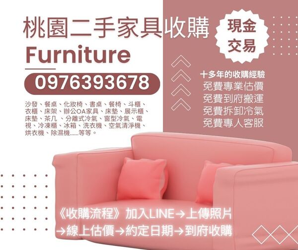 大桃園家電回收找我們,舊家電立即變現金! 在現代家庭生活中,家電產品更新速度快,許多家庭在更換新電器時,往往面臨「舊家電不知道如何處理」的困擾。直接丟棄不但可惜,也可能造成環境負擔。如果您家中有不再使用的家電設備,不論是汰舊換新、搬家整理、店面結束營業,或是公司設備更新,都非常適合透過專業家電回收服務來處理,不僅省時省力,還能將閒置物品換成現金回收。 我們專營大桃園地區家電回收服務,多年回收經驗、估價公道透明,提供到府評估與快速收購服務,讓您的舊家電不再佔空間。只要一通電話或傳照片評估,即可快速了解回收價格,專人到府搬運,讓回收流程簡單又安心。 📺 回收家電項目 ❄️ 冷氣設備回收 分離式冷氣 窗型冷氣 變頻冷氣 商用大型冷氣機 🧊 冰箱系列回收 單門冰箱 雙門冰箱 三門 / 多門冰箱 對開門冰箱 營業用冷藏冰箱 冷凍櫃 / 冷藏櫃 📺 影音家電回收 液晶電視 LED電視 智慧型電視 家庭劇院設備 🧺 生活家電回收 洗衣機(直立式 / 滾筒式) 烘衣機 電風扇 空氣清淨機 除濕機 🍳 廚房家電回收 微波爐 烤箱 電磁爐 洗碗機 飲水機 🏢 商用電器回收 營業用冰箱 商用冷凍櫃 製冰機 展示冰箱 餐飲設備電器 ⭐ 我們的服務特色 ✔ 專業估價:依品牌、年份、功能狀況合理評估 ✔ 到府回收:大桃園地區專人到府搬運 ✔ 現金收購:現場估價滿意立即成交 ✔ 快速處理:省去自行搬運與清運麻煩 ✔ 環保回收:專業分類處理,減少環境負擔 📍 服務地區 大桃園全區服務,包括: 桃園區、中壢區、平鎮區、八德區、龜山區、蘆竹區、楊梅區、大溪區、龍潭區、觀音區、新屋區等地區皆可預約回收。 如果您家中有閒置家電、二手電器、汰換設備,歡迎與我們聯絡評估。 大桃園家電回收,專業服務、價格公道,讓舊家電輕鬆換現金! 📞0976393678(同LINE ID) 桃園二手家具收購