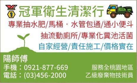 聯 絡 人:冠軍衛生清潔行 聯絡電話:0921877669 通訊地址:桃園縣中壢區仁美2街126巷7號
