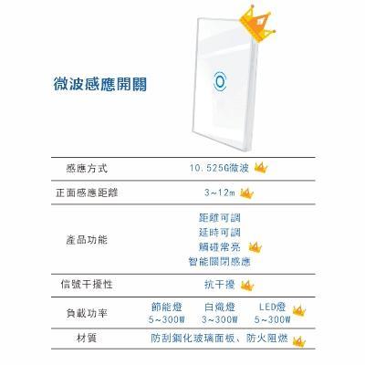 微波感應開關─利用微波感應技術來控制燈光開關的裝置,微波感應距離可設定,可設定自動亮燈時間、自動偵測光源、自動切換關燈模式、單線火線控制、超低功\耗